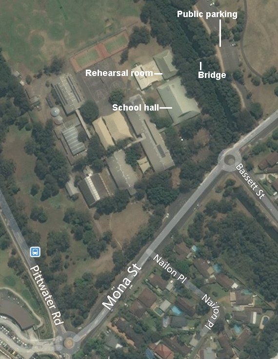 Unless notified otherwise, all rehearsals take place in the Rehearsal Room at the rear of the school hall, Mona St. Mona Vale.  Parking is in the carpark of the Winnererremy Bay Foreshore Reserve, which is the next driveway past the school.  If you do not have a Northern Beaches Council sticker, parking in the reserve is not free, and the rangers are known to be present on the weekends.  Access to the Rehearsal Room is across a foot bridge (see map).